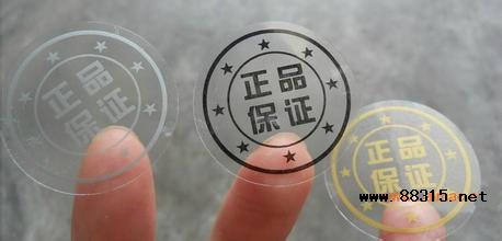 c) 激光標封口貼,激光標具有一定的防偽性,同時也比較美觀,在很多產品上均有使用;還有一種透明激光標(介質膜激光標)也常用來做封口貼。
