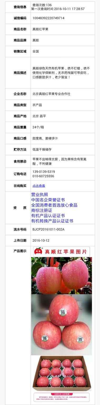 移動二維碼技術在國際上是一項成熟的防偽技術,可以幫助消費者快速、準確地了解到自己需要產品信息。將二維碼制成標簽貼在蘋果農產品包裝上;消費者購買產品時,只需手機掃碼,即可隨時隨地查詢產品源信息與質量認證等信息等,并可及時舉報虛假、錯誤信息。