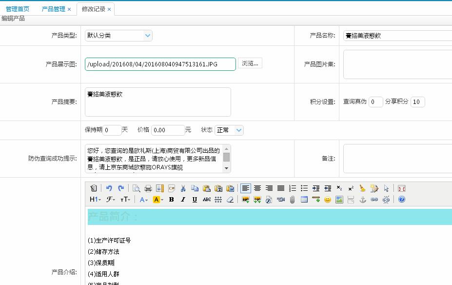 產(chǎn)品管理涉及到最終消費(fèi)者查詢顯示的大部分信息,包括頂上的產(chǎn)品名稱、產(chǎn)品圖片,真?zhèn)挝淖中畔ⅲa(chǎn)品的詳細(xì)信息。