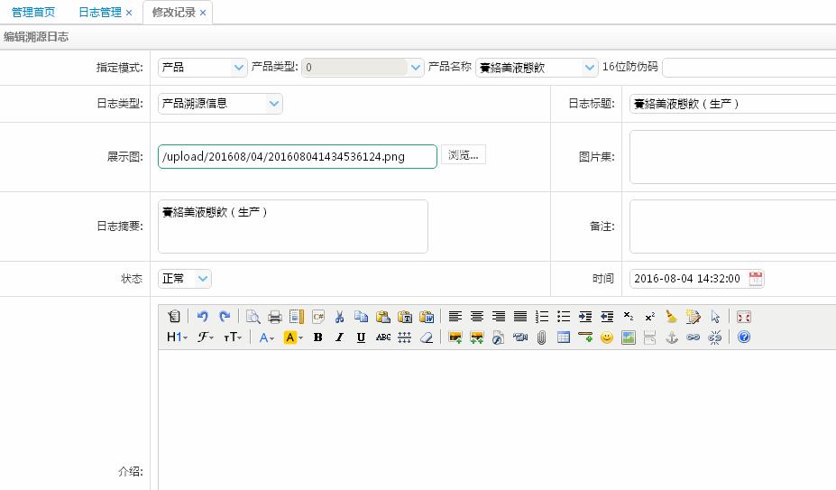 日志管理可以設(shè)定具體的溯源信息,即設(shè)定產(chǎn)品在每個(gè)關(guān)鍵生產(chǎn)工序以及流通環(huán)節(jié)的相關(guān)信息及照片。