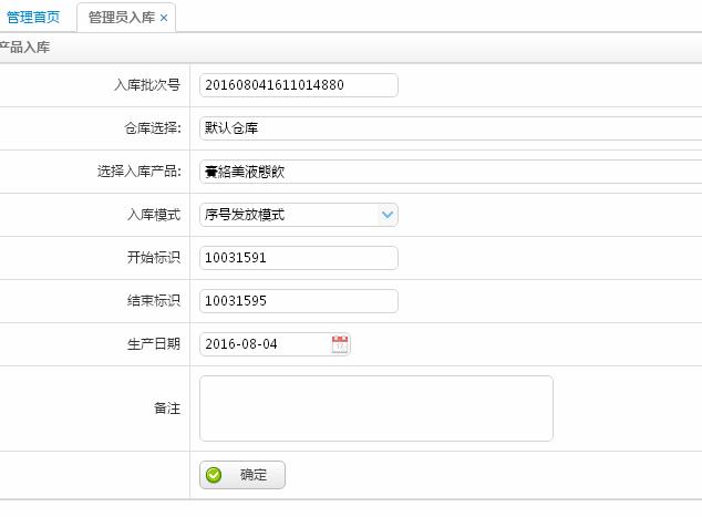 入庫管理中,倉庫選擇默認(rèn)倉庫,選擇相應(yīng)的產(chǎn)品,入庫模式很重要,是選擇序號(hào)發(fā)放模式,只有選擇此項(xiàng),后面才有開始標(biāo)識(shí)和結(jié)束標(biāo)識(shí)。號(hào)碼段是從小到大。