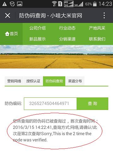 點擊防偽碼查詢后,進入官網的防偽查詢網頁(手機站頁面)