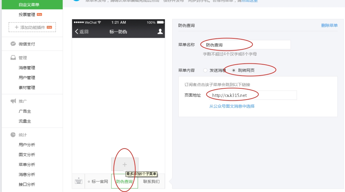 添加的鏈接可以是默認(rèn)防偽查詢地址http://cx.k315.net(手機(jī)版),也可以是專門(mén)制作的網(wǎng)頁(yè),也可以企業(yè)自己微網(wǎng)站的某一頁(yè)面。