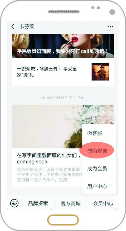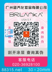 開啟微信掃一掃功能,掃描標簽上的微信二維碼,點擊關注,而進入相應的公眾號平臺,在操作菜單中選擇相應的防偽查詢,點擊進入可實現防偽查詢,消費者同時也可以關注微信號更多信息,商家也可以通過平臺進行相關管理,如定期抽獎等。